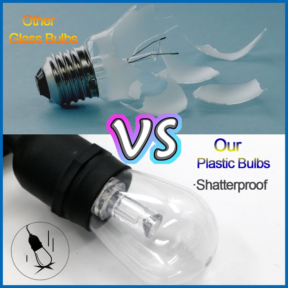 Patio string light outdoor are made of sturdy plastic, bulbs will not break when dropped on.